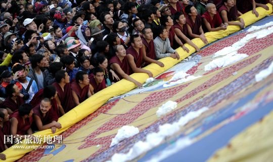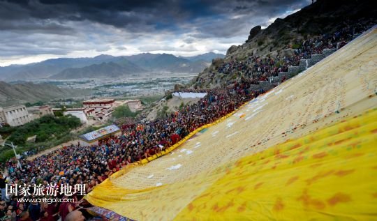 國家旅游地理 西藏拉薩8月6日訊 8月6日,拉薩哲蚌寺舉行展佛儀式。當日,以西藏最大的格魯派寺廟哲蚌寺展佛為開端的雪頓節(jié)在拉薩拉開序幕。每年藏歷六月底七月初是西藏傳統(tǒng)的節(jié)日“雪頓節(jié)”。在藏語中,“雪”是酸奶子的意思,“頓”是“吃”“宴”的意思,“雪頓節(jié)”按藏語解釋就是吃酸奶子的節(jié)日,因此又叫“酸奶節(jié)”。因為“雪頓節(jié)”期間有隆重熱烈的藏戲演出和規(guī)模盛大的曬佛儀式,所以有人也稱之為“藏戲節(jié)”“曬佛節(jié)”。 /新華社記者 普布扎西攝