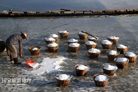 國家旅游地理 浙江臺州8月10日訊 8月10日,在浙江溫嶺市石塘鎮(zhèn)蒼岙鹽場,一名鹽工頂著太陽在鹽田里把曬好的鹽收集起來挑到鹽堆去。連日來,浙江省溫嶺市石塘鎮(zhèn)蒼岙鹽場的鹽工利用晴熱天氣忙著曬鹽。對于浙江的曬鹽人來說,夏季陽光最猛烈的7月、8月、9月這三個月是他們勞作的黃金季節(jié)。天氣越炎熱,光照越猛烈,曬鹽效果就越好。炎熱的夏天艷陽高照,而曬鹽人卻要頂著高溫出門勞作。 /新華社發(fā)(梁敏慧 攝)