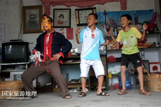 國(guó)家旅游地理 廣西河池8月19日訊 8月18日,譚圣慈老人(左一)帶著前來(lái)學(xué)習(xí)的兩名男孩跳儺面舞。在廣西北部與貴州交界一帶的我國(guó)唯一的毛南族自治縣——環(huán)江毛南族自治縣,神秘的儺戲被譽(yù)為毛南族的“族寶”。原始古樸、風(fēng)格獨(dú)特的儺戲是毛南族的民間傳統(tǒng)舞蹈,藝人在表演過(guò)程中經(jīng)常戴著被稱為儺面的木制面具。儺面一般高30厘米、寬20厘米,由毛南族藝人在民族口頭文學(xué)的基礎(chǔ)上依據(jù)個(gè)人想象創(chuàng)作,用優(yōu)質(zhì)木塊雕琢而成,共有文、武、善、兇四大類72種面相。