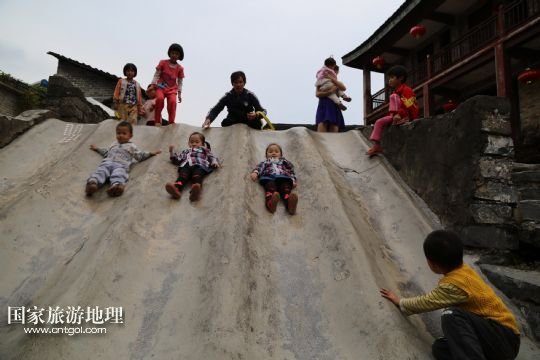 9月26日,孩子們?cè)趶V西昭平縣黃姚古鎮(zhèn)玩滑梯。