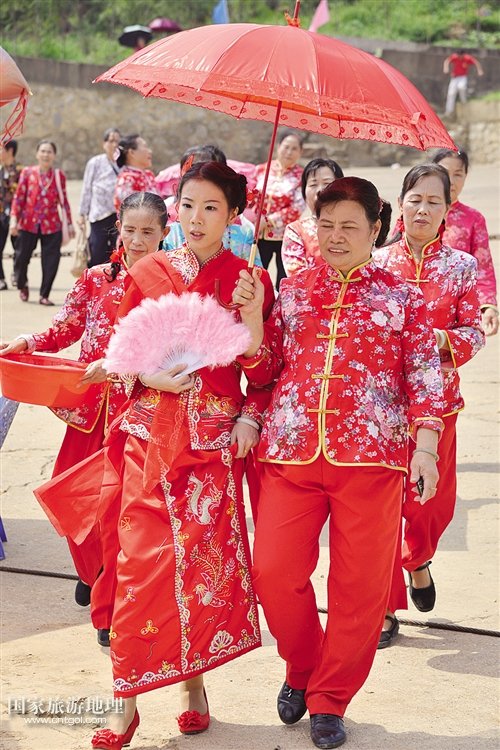 “五世其昌”的祝福對(duì)聯(lián),大紅的喜慶燈籠,插滿青草與鮮花的漁船顯得古樸而富有情調(diào)。而岸上的儀式也頗有講究:一張精心準(zhǔn)備的圓桌,擺著一盆四季橘,一只展翅欲飛、口銜“金幣”的“鳳凰雞”,寓意飛黃騰達(dá)。一對(duì)紅燭、算盤、鏡子、糯米飯等物品,均取吉祥如意之意。迎娶新娘的時(shí)辰未到,新娘的兩位兄嫂幫她梳妝打扮,描眉盤發(fā),給發(fā)髻插上珠玉釵,換上喜氣的紅綢裙,一番梳妝打扮之后,新娘變得美艷動(dòng)人。裝扮完畢,新娘邀請(qǐng)自家姐妹及親戚“擺歌堂”,感激父母養(yǎng)育之恩,傾訴依依惜別之情。