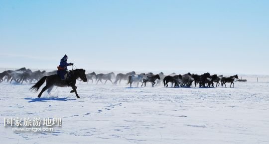 一名牧民在內蒙古赤峰市克什克騰的雪原上牧馬(2012年2月3日攝)