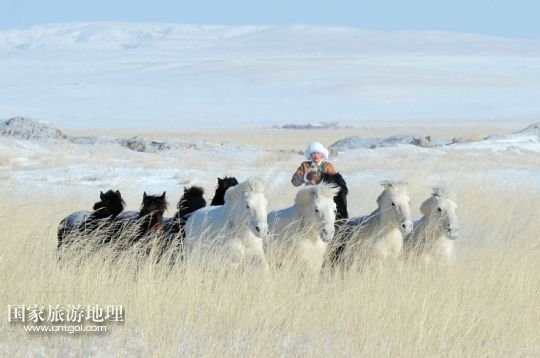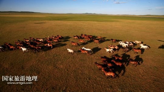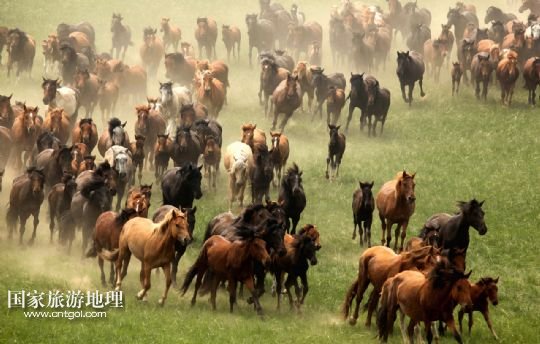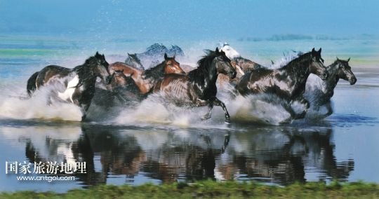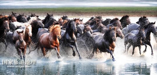 國家旅游地理 1月30日訊 一群蒙古馬在內蒙古錫林郭勒盟阿巴嘎旗涉水奔馳(2013年7月20日攝)。風從草原吹過,留下多少傳說。在內蒙古草原,駿馬與人為伴,縱橫馳騁,一直和諧相處到今天。在漫長的歷史長河中,駿馬陪伴著人們走過了滄桑歲月,留下了許多可歌可泣的動人傳說。