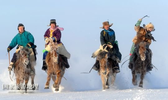 牧民在內蒙古呼倫貝爾市新巴爾虎左旗的冬季賽馬會上策馬揚鞭(2011年1月1日攝)。