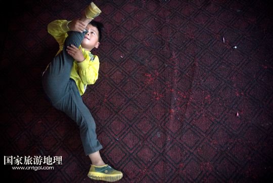 剛來到這里的孩子都要從最基本的壓腿、翻跟頭等基礎(chǔ)訓(xùn)練學(xué)起,練好基本功后大部分孩子會(huì)離開學(xué)校,過幾年長大一些再回來學(xué)些雜技表演動(dòng)作,學(xué)得好就可以上臺參與表演。